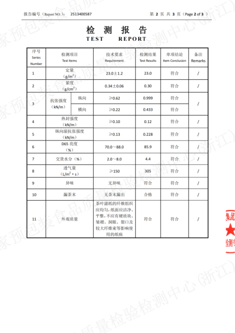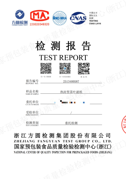 我們的茶包材料是由專業(yè)廠家生產(chǎn)的熱封型茶葉濾紙,并經(jīng)過國家認證檢測機構(浙江方圓檢測集團)的全面檢測,21項關鍵指標均100%符合國家標準,包括: