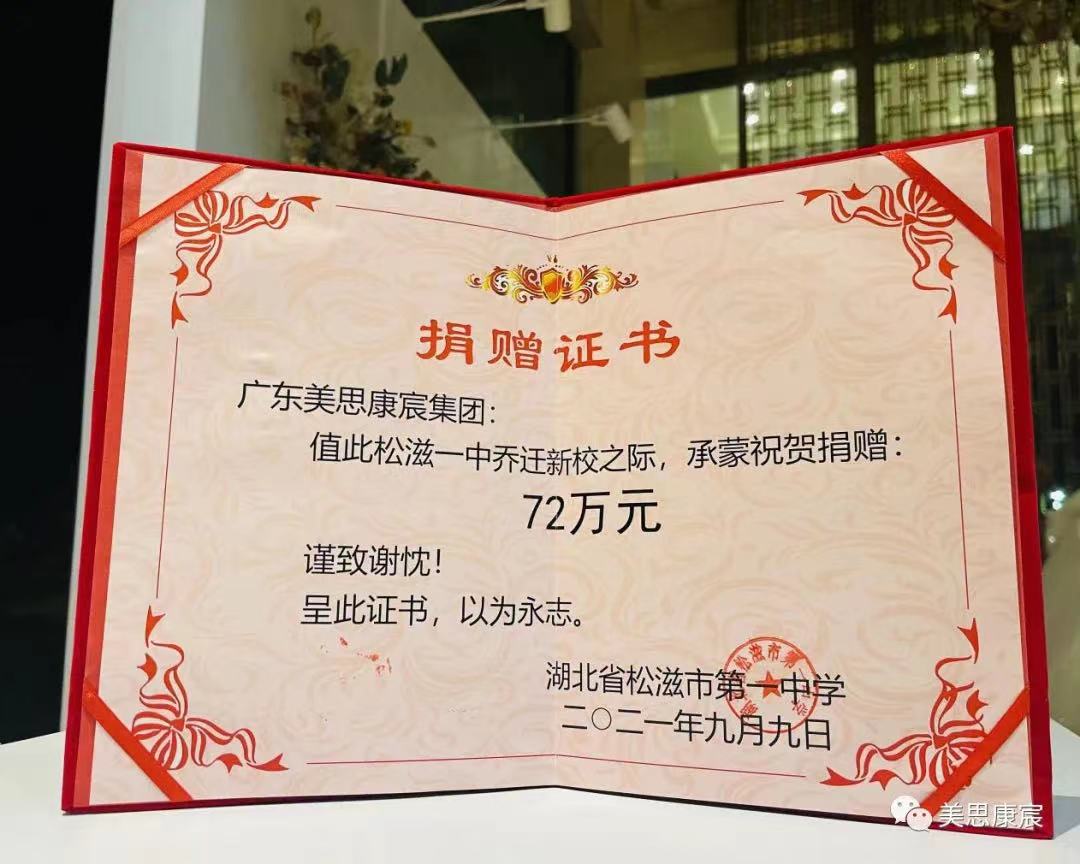 2021年9月9日,在教師節(jié)即將來臨之際,美思康宸來到松滋一中,舉行捐贈助學(xué)金儀式。正值第37個教師節(jié)之際,美思康宸在捐贈50萬元后,現(xiàn)場又籌集了22余萬元教育專項善款。前后美思康宸共為松滋一中捐贈獎學(xué)教助金72萬元整,少年強則國強,美思康宸,希望更多的優(yōu)秀學(xué)子能夠奮發(fā)圖強,學(xué)好本領(lǐng),增長才干,將來以自身之力報效祖國,回饋社會,反哺家鄉(xiāng)。重視教育就是保護未來,發(fā)展教學(xué)工作功在當代利在千秋。